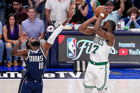 Boston Celtics guard Jaylen Brown (7) shoots against Dallas Mavericks forward Tim Hardaway Jr. (10) during the second half in Game 3 of the NBA basketball finals in Dallas.