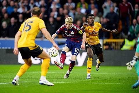 Newcastle United's Anthony Gordon (centre) has a shot on goal which hits the post during the British Premier League soccer match between Wolverhampton Wanderers and Newcastle United, at Molineux Stadium, Wolverhampton, England.