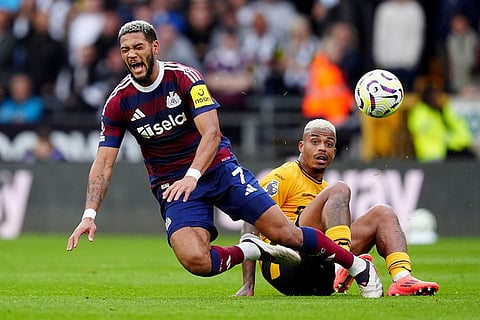 Newcastle United's Lewis Hall (left) and Wolverhampton Wanderers' Jorgen Strand Larsen battle for the ball during the British Premier League soccer match between Wolverhampton Wanderers and Newcastle United, at Molineux Stadium, Wolverhampton, England.