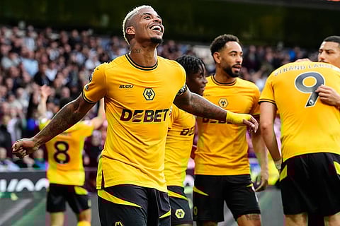 Wolverhampton Wanderers' Mario Lemina celebrates scoring his side's first goal during the British Premier League soccer match between Wolverhampton Wanderers and Newcastle United, at Molineux Stadium, Wolverhampton, England.