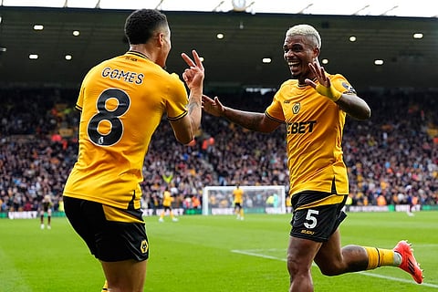 Wolverhampton Wanderers' Mario Lemina, right, celebrates scoring his side's first goal during the British Premier League soccer match between Wolverhampton Wanderers and Newcastle United, at Molineux Stadium, Wolverhampton, England.