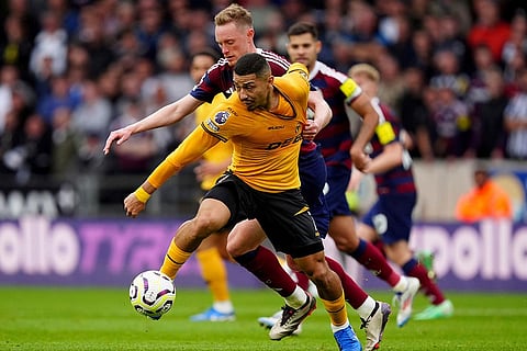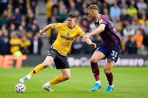 Newcastle United's Anthony Gordon (right) takes on Wolverhampton Wanderers' Yerson Mosquera (left) during the British Premier League soccer match between Wolverhampton Wanderers and Newcastle United, at Molineux Stadium, Wolverhampton, England, Sunday, Sept. 15, 2024. ()