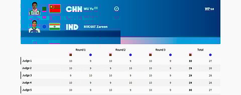Wu Yu takes first round with a 4:1 decision from the judges. Nikhat needs to come up with something special here.