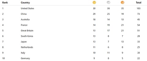United States sit pretty in first with 30 gold medals, while China are second with 29.