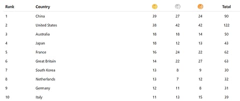 China lead the medal charts with 39 gold medals, while United States are second with 38.