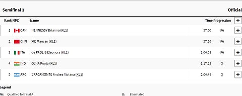 Pooja Ojha finished fifth in heat 2 clocking 1:16.09 on September 6 in the Women's KL1 200m event at the Paris Paralympics to qualify for the semifinals 1.