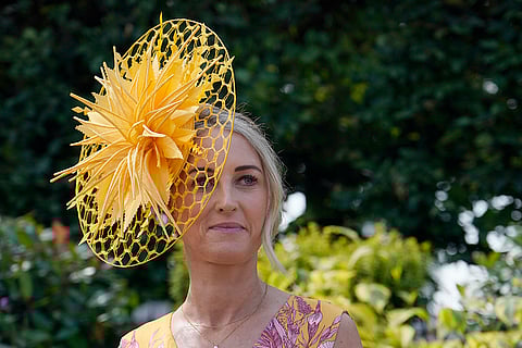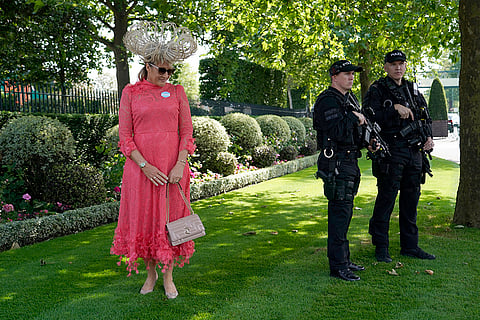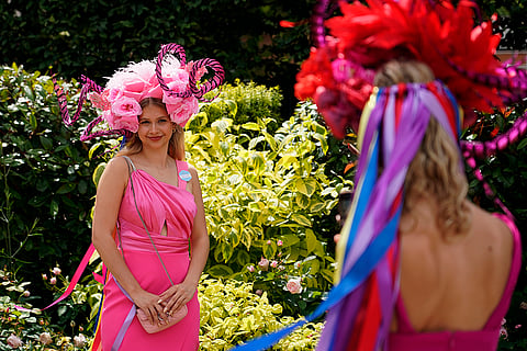 Britain's King Charles III prepares to present trophies to the owner and trainer of Asfoora ridden by jockey Oisin Murphy, the winning horse of the King Charles II Stakes horse race on the first day of the Royal Ascot horse race meeting at Ascot, England.