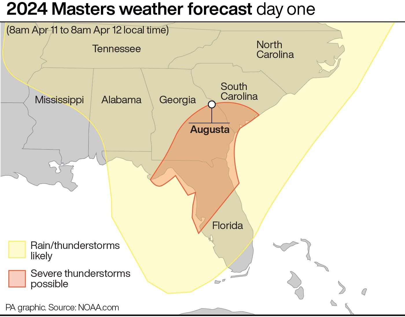 Honorary starters Jack Nicklaus, Gary Player and Tom Watson were scheduled to kick off proceedings by each hitting a tee shot on the first hole 20 minutes earlier.