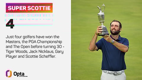 At his post-tournament press conference, Scheffler was informed that his fourth major win came 1,197 days after his first – the exact amount of time that passed between Woods' first and fourth victories, at the Masters in 1997 and The Open in 2000.