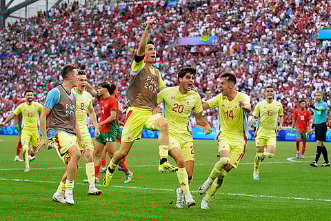 Spain's Juanlu Sanchez, center, celebrates scoring his side's second goal during a men's semifinal soccer match between Morocco and Spain at the 2024 Summer Olympics at Marseille Stadium in Marseille, France.