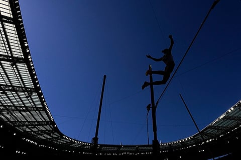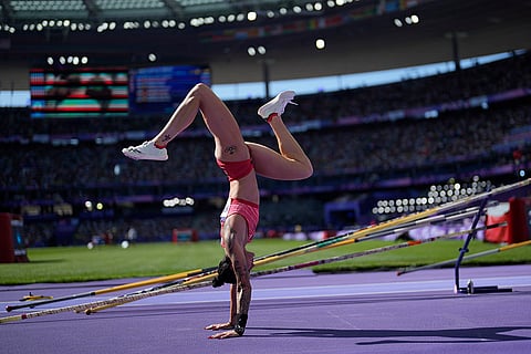 Hanga Klekner, of Hungary, competes during the women's pole vault qualification at the 2024 Summer Olympics in Saint-Denis, France.