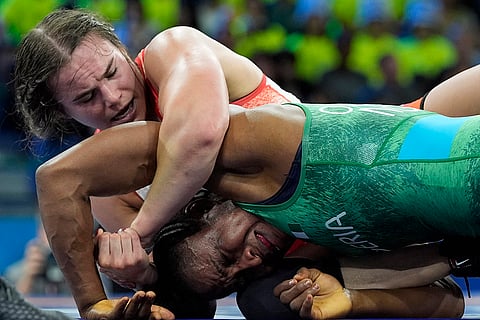 Canada's Linda Morais and Nigeria's Blessing Oborududu, right, compete in the round of 16 of the women's freestyle 68kg category, at Champ-de-Mars Arena, during the 2024 Summer Olympics in Paris, France.