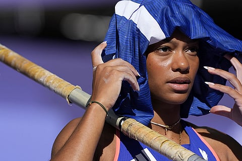 Marie-Julie Bonnin, of France, prepares for the women's pole vault qualification at the 2024 Summer Olympics in Saint-Denis, France.