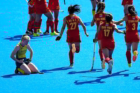 Australia's Amy Lawton reacts as Chinese players celebrate their win in the women's quarterfinal field hockey match between China and Australia at the Yves-du-Manoir Stadium during the 2024 Summer Olympics in Colombes, France.