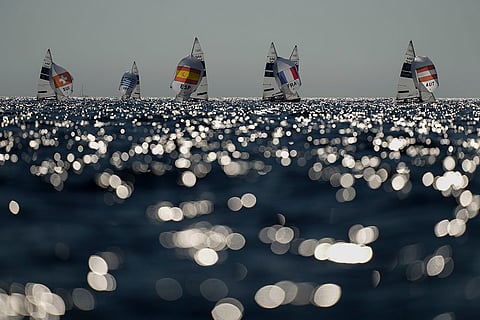 From left, Lara Vadlau and Lukas Maehr of Austria, Odyssead Spanakis and Ariadni Spanaki of Greece, Jordi Xammar Hernandez and Nora Brugman Cabot of Spain, Jérémie Mion and Camille Lecointre of France and Lara Vadlau and Lukas Maehr of Austria compete in a 470 mixed dinghy class race during the 2024 Summer Olympics in Marseille, France. The race was abandoned because of the light wind.