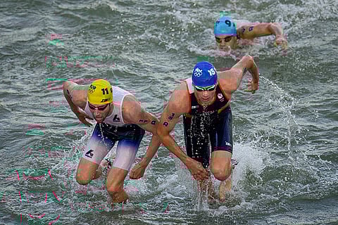 Norway's Vetle Bergsvik Thorn, left, and Mitch Kolkman, of the Netherlands, right, exit the water at the end of the swim leg of mixed relay triathlon at the 2024 Summer Olympics in Paris, France.