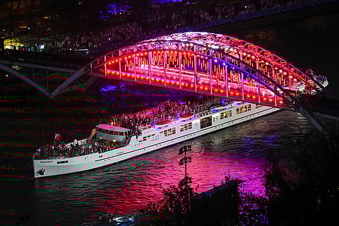 Floriane Issert, a Gendarmerie non-commissioned officer of the National Gendarmerie, rides on a horse while leading volunteers carrying flags of Olympic teams on the Iena Bridge in Paris, France, during the opening ceremony of the 2024 Summer Olympics