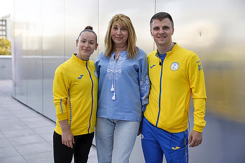 From left, Oksana Kozyna, Svitlana Shabalina, and Oleksandr Chyrkov of Ukraine pose for a portrait at Arena Porte de La Chapelle during the Paralympic Games in Paris.