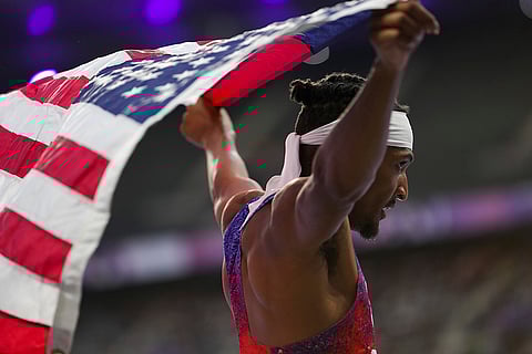 Jayden Blackwell from the U.S celebrates after winning the Men's 400m T38 race during the 2024 Paralympics in Paris, France.