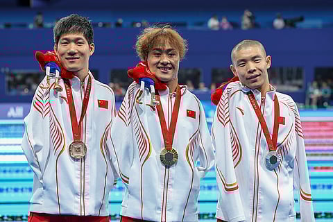Yuan Weiyi, Guo Jincheng and Wang Linchao, of China, celebrate their first, second and third position at the podium of Men's 50m Backstroke -S5 during the 2024 Paralympics in Paris, France.