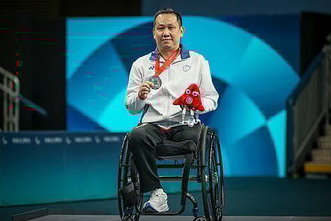Taiwan's Cheng Ming Chih poses with the silver medal after losing against Norway's Tommy Urhaug during the para table tennis men's singles MS5 gold medal match during the 2024 Paralympics in Paris, France.