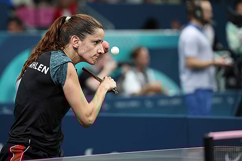 Norway's Aida Dahlen competes against Japan's Yuri Tomono in the Women's WS8 Singles Quarterfinal, during the 2024 Paralympics in Paris, France.