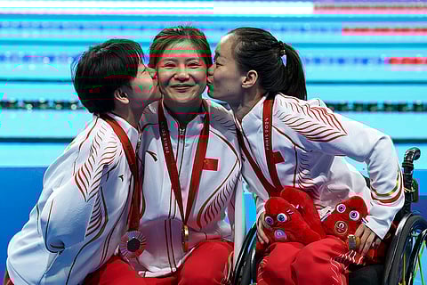 Lu Dong, He Shenggao and Liu Yu, of China, celebrate their first, second and third position at the podium of Women's 50m Backstroke -S5 during the 2024 Paralympics in Paris, France.