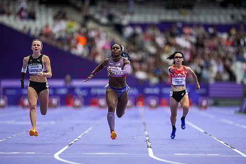 Brittni Mason from the U.S., centre, competes in the women's 100 m. T47 during the 2024 Paralympics in Paris, France.