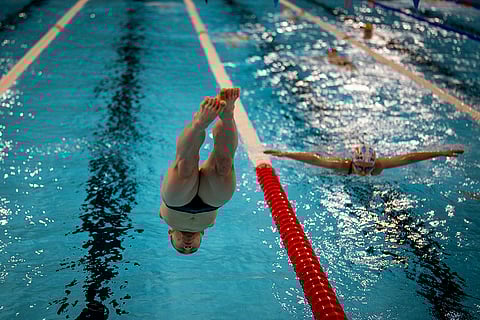 Guo Jincheng, of China, jumps into the pool during a warm up session ahead of a competition, during the 2024 Paralympics in Paris, France.