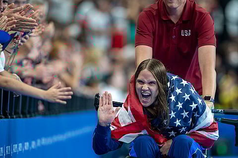Christie Raleigh-Crossley, of the U.S., greets supporters after winning at Women's 100m Backstroke -S9 during the 2024 Paralympics in Paris, France.
