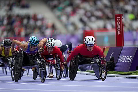 Switzerland's Catherine Debrunner, right, and Susannah Scaroni of the U.S., foreground left, compete for the lead of the women's 1500 m. T54 during the 2024 Paralympics in Paris, France.