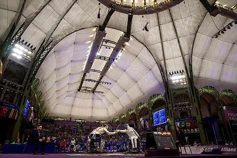 France's Clémence Delavoipière, left, fights against Italy's Andreea Mogos during a Wheelchair Fencing Women's Sabre Cat. A, at the 2024 Paralympics in Paris, France.