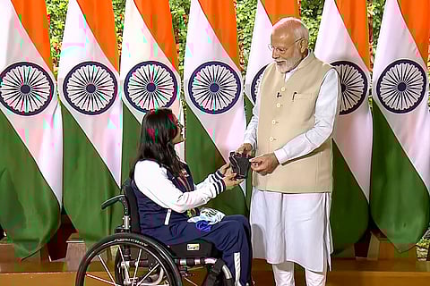 Prime Minister Narendra Modi with para-shooter Avani Lekhara during an interaction with India's Paris Paralympics contingent, in New Delhi.