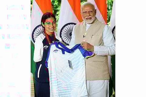 Prime Minister Narendra Modi meets para-archer Sheetal Devi, who won silver medal at Paris Paralympics 2024, in New Delhi.