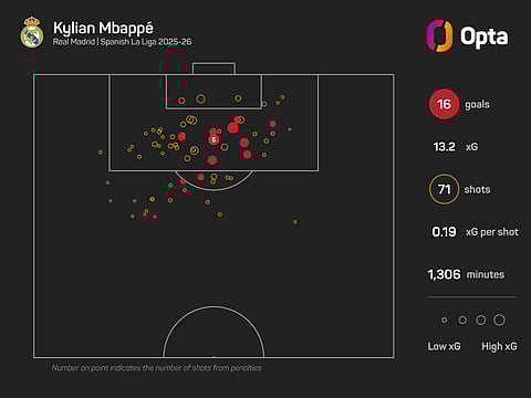 Mbappe has netted 16 times in 15 games in LaLiga this season, with those goals coming from an expected goals (xG) figure of 13.2.