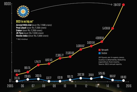 The BCCI, the wealthiest cricket body in the world, reached another milestone in 2016-17 when it broke the Rs 7,000-crore barrier. Its net worth, as on March 31, 2016, was Rs 7,847.07 crore—over 191 times what it was 20 years ago. In 1995-96, BCCI was worth Rs 41.03 crore and made a surplus of Rs 23.50 crore. Just before the 1993 home series against England, then BCCI president I.S. Bindra and secretary Jagmohan Dalmiya sold the telecast rights for the home England series to TWI for $6,00,000 a match. Earlier, it used to pay Doordarshan to have the matches telecast. It has not looked back since.