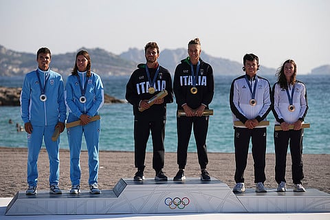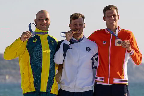 Toni Vodisek, of Slovenia, left, with silver, an enthusiastic Valentin Bontus, of Austria, with gold, and Max Maeder, of Singapore, with bronze, hold up their medals during the Olympic medal ceremony for the men's kite during the 2024 Summer Olympics in Marseille, France.