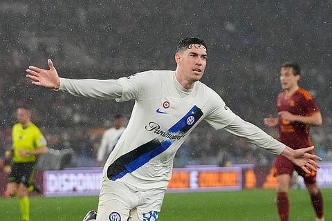 Inter Milan's Alessandro Bastoni celebrates after scoring the fourth goal against Roma during the Italian Serie A soccer match between Roma and Inter Milan at Rome's Olympic stadium.