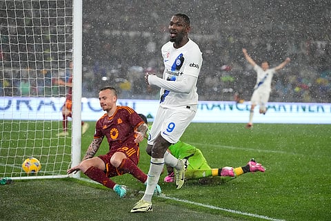 Inter Milan's Marcus Thuram, right, scores against Roma during the Italian Serie A soccer match between Roma and Inter Milan at Rome's Olympic stadium.
