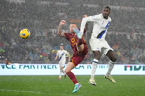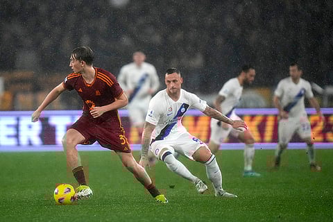 Roma's Dean Huijsen, left, controls the ball during the Italian Serie A soccer match between Roma and Inter Milan at Rome's Olympic stadium.