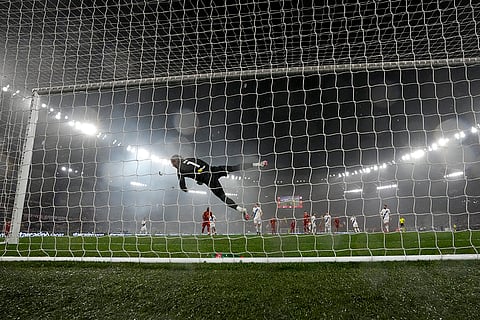Inter Milan's goalkeeper Yann Sommer jumps for the ball during the Italian Serie A soccer match between Roma and Inter Milan at Rome's Olympic stadium.