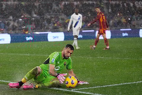 Roma's goalkeeper Rui Patricio saves the ball during the Italian Serie A soccer match between Roma and Inter Milan at Rome's Olympic stadium.