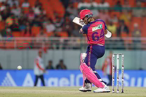Rajasthan Royals' Riyan Parag plays a shot during the Indian Premier League cricket match between Punjab Kings and Rajasthan Royals in Mohali.