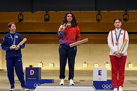 L to R on the podium, Turkey's Savval Ilayda Tarhan and Yususf Dikec, Serbia's Zorana Arunovic and Damir Mikec, and India's Manu Bhaker and Sarabjot Singh pose for a photograph after the medal ceremony of the 10m air pistol mixed team event at the 2024 Summer Olympics in Chateauroux, France.
