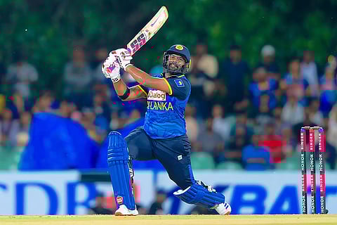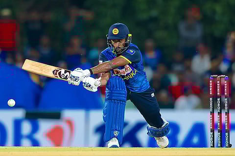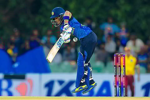 Sri Lanka's Kamindu Mendis plays a shot during the first Twenty20 cricket match between Sri Lanka and West Indies in Dambulla, Sri Lanka.