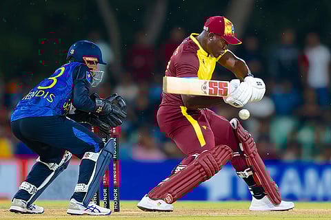 West Indies's Captain Rovman Powell plays a shot during the first Twenty20 cricket match between Sri Lanka and West Indies in Dambulla, Sri Lanka.
