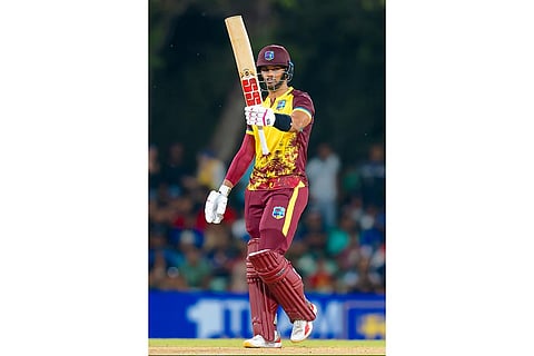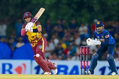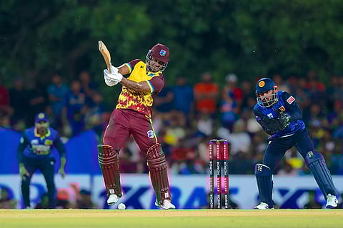 West Indies' Brandon King plays a shot during the first Twenty20 cricket match between Sri Lanka and West Indies in Dambulla, Sri Lanka.