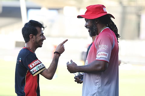 Chris Gayle and Yuzvendra Chahal before the RCB vs KXIP match in Sharjah on Thursday. (BCCI photo)