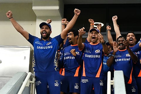 Rohit Sharma and Mumbai Indians team reacts after winning the IPL in Dubai on Tuesday. Photo: BCCI