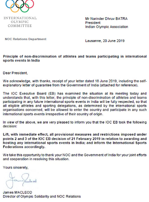 The International Olympic Committee lifted its restrictions inflicted on India, regarding hosting rights. The announcement came two days after the union government promised that all eligible athletes would be given visa, and it won't be judged politically.